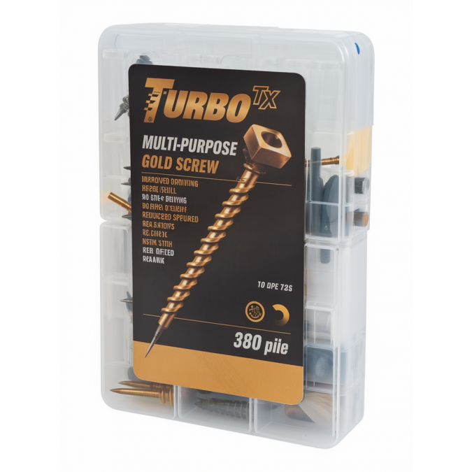 The Turbo TX Handy Pack (380 Pieces) is a compact, essential selection of high-performance multi-purpose screws ideal for various fastening jobs. Engineered with a double-countersunk head to reduce the risk of timber splitting and a sharp, self-piercing point for fast, precise starts. The screws feature a wax-coated thread for reduced drive torque and smoother insertion, while the gold passivated finish ensures enhanced corrosion resistance. Supplied in a durable and portable handy box for easy storage and transport.